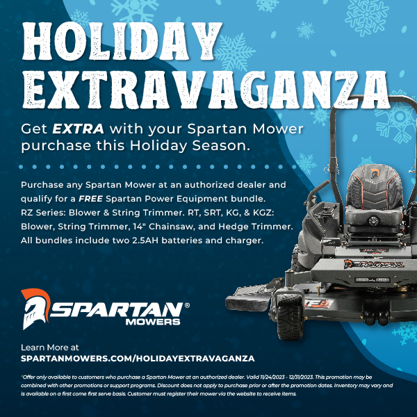You can also score some extra gifts with the purchase of any new Spartan Mower. Depending on the series, you can get a FREE Spartan Power Equipment bundle of either two or four pieces plus batteries and a charger.