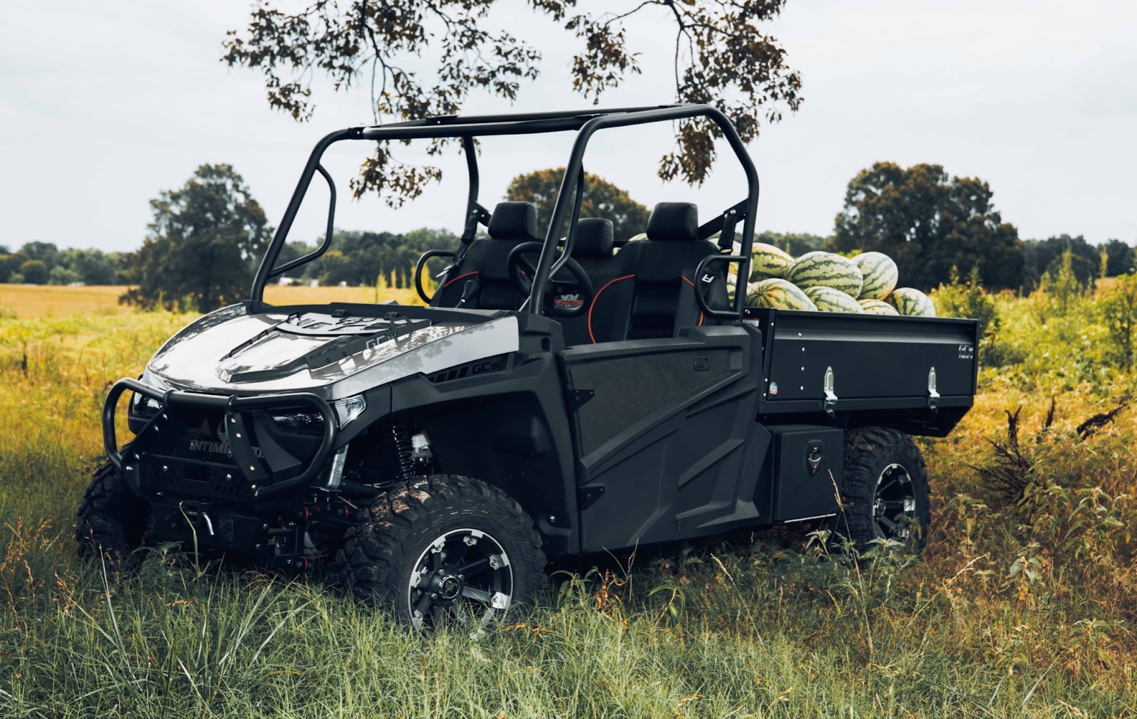 The Intimidator electric UTV is an amazing option, offering a 4-wheel hydraulic disc braking system, towing capacity of 1500 pounds, payload capacity of 1200 pounds, a standard 2" receiver hitch, and a 700-pound capacity cargo bed that dumps. The newly-designed battery packs also hold twice the power as their predecessors and are quickly charged.